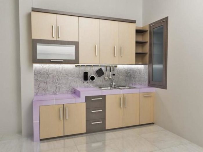 - Skema Putih-Abu-Abu-Krem: Warna-warna netral ini memberikan kesan bersih dan luas. Cocok untuk dapur berukuran kecil.